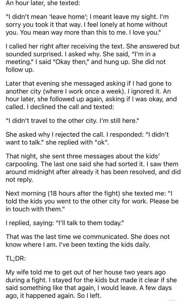 My wife (40 F) told me (40 M) to leave (again), so i did.